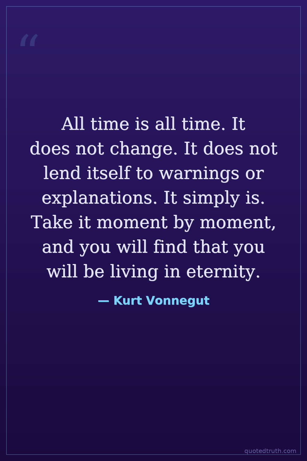 All time is all time. It does not change. It does not lend itself to warnings or explanations. It simply is. Take it moment by moment, and you will find that you will be living in eternity.