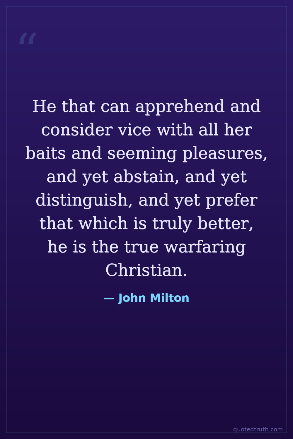 He that can apprehend and consider vice with all her baits and seeming pleasures, and yet abstain, and yet distinguish, and yet prefer that which is truly better, he is the true warfaring Christian.