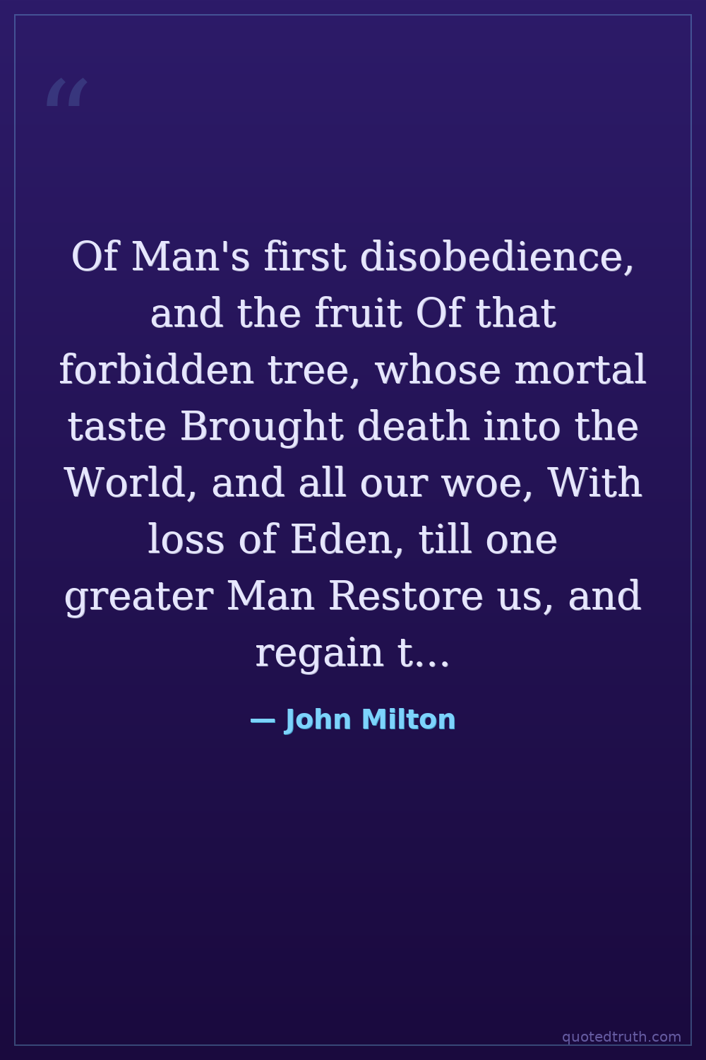 Of Man's first disobedience, and the fruit Of that forbidden tree, whose mortal taste Brought death into the World, and all our woe, With loss of Eden, till one greater Man Restore us, and regain the blissful Seat, Sing Heav'nly Muse.
