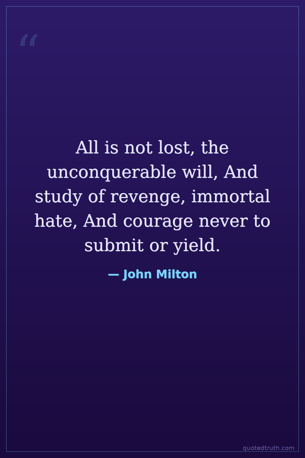 All is not lost, the unconquerable will, And study of revenge, immortal hate, And courage never to submit or yield.