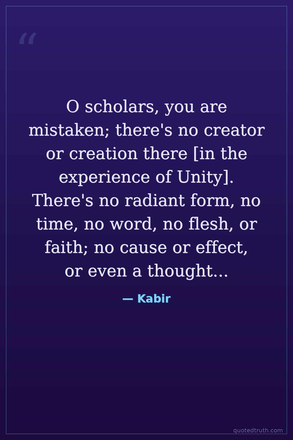 O scholars, you are mistaken; there's no creator or creation there [in the experience of Unity]. There's no radiant form, no time, no word, no flesh, or faith; no cause or effect, or even a thought of the Vedas. There's no Hari or Brahma, no Shiva or Shakti, no pilgrimages or rituals; There is no mother, no father, no Guru; think! Is it two or is It One? Kabir says: If you understand this, you are the teacher and I am the disciple.