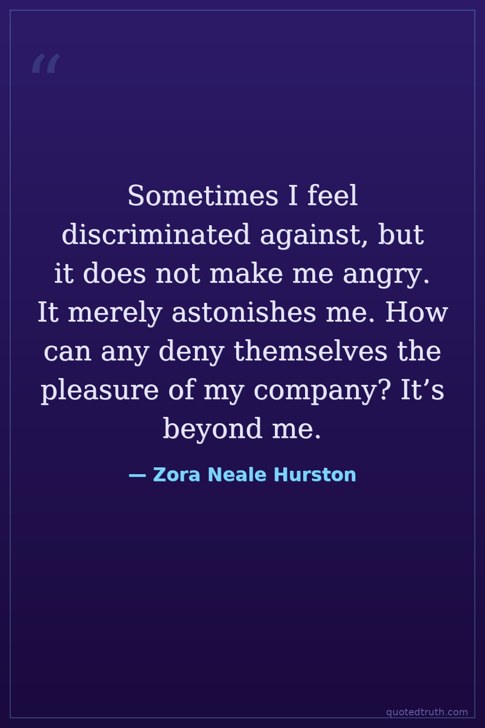 Sometimes I feel discriminated against, but it does not make me angry. It merely astonishes me. How can any deny themselves the pleasure of my company? It’s beyond me.