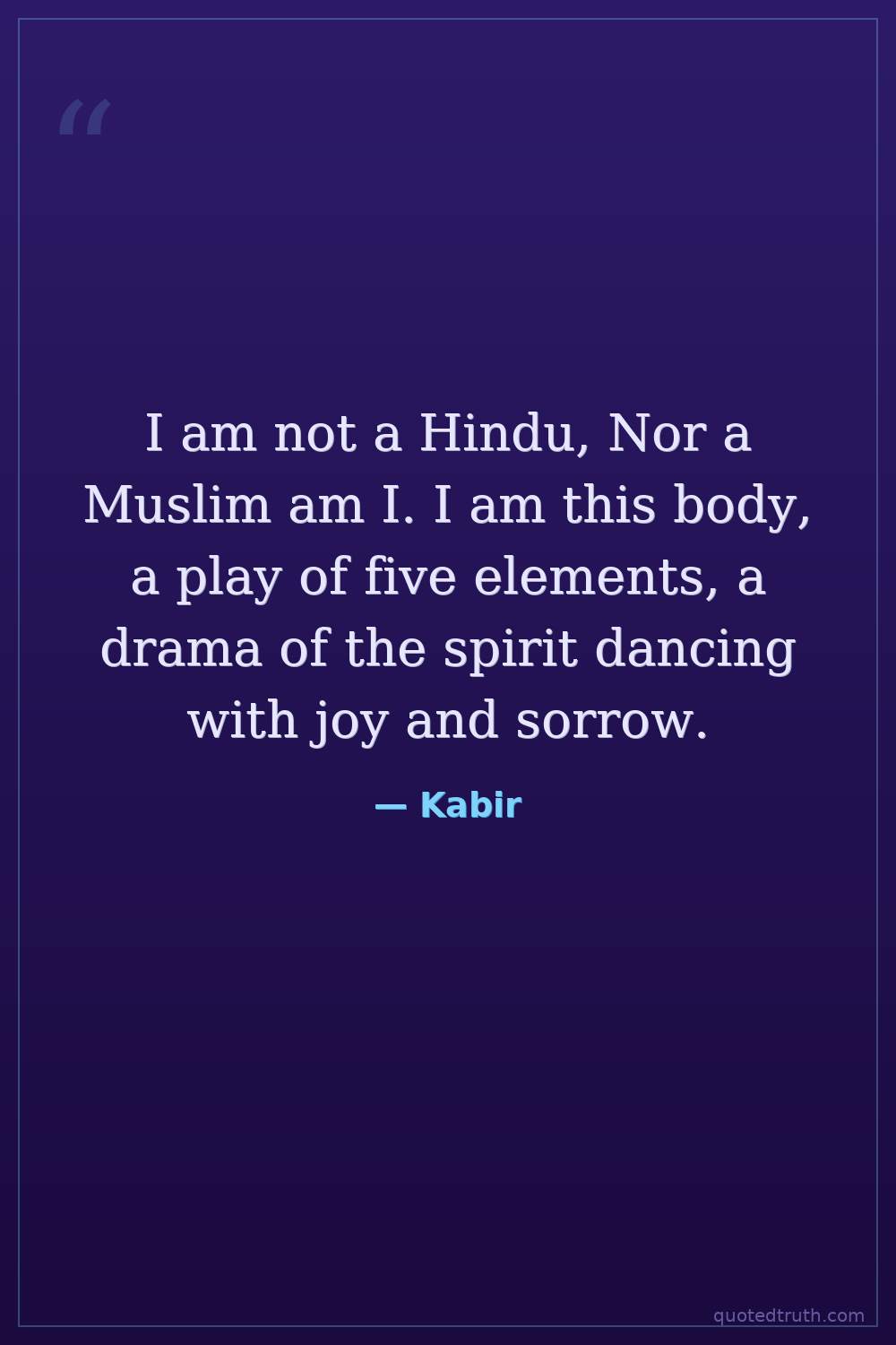 I am not a Hindu, Nor a Muslim am I. I am this body, a play of five elements, a drama of the spirit dancing with joy and sorrow.