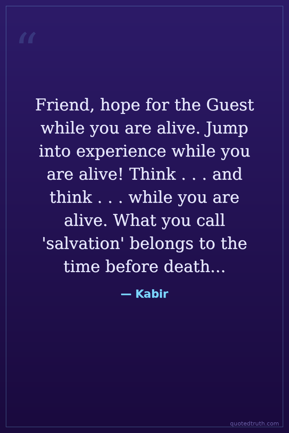 Friend, hope for the Guest while you are alive. Jump into experience while you are alive! Think . . . and think . . . while you are alive. What you call 'salvation' belongs to the time before death . . . .