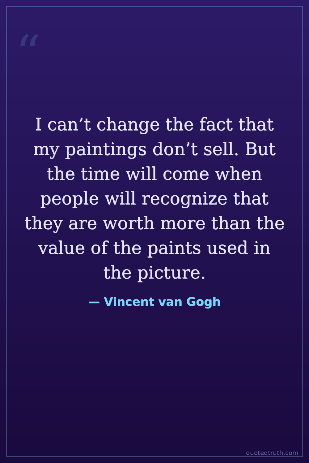 I can’t change the fact that my paintings don’t sell. But the time will come when people will recognize that they are worth more than the value of the paints used in the picture.