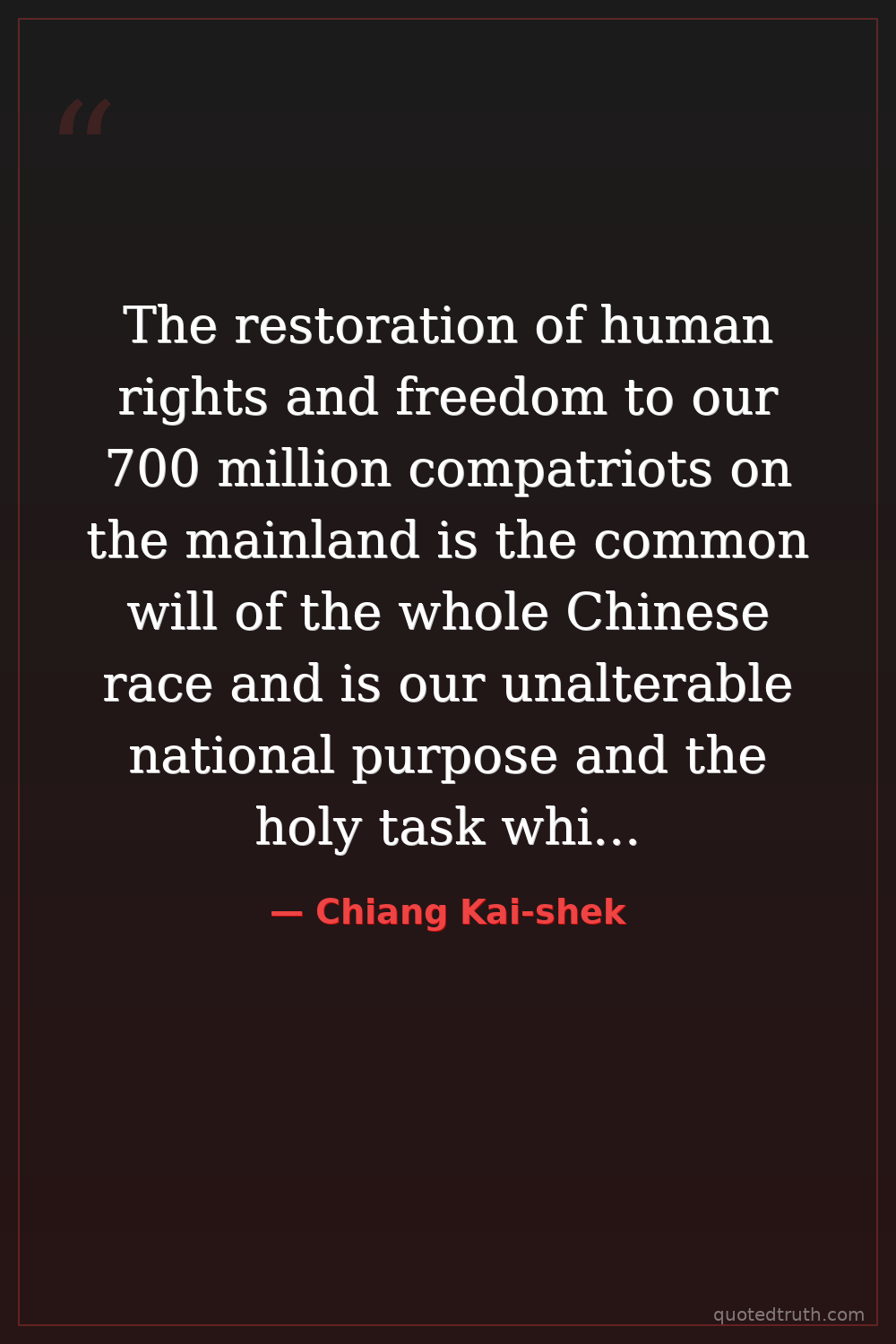 The restoration of human rights and freedom to our 700 million compatriots on the mainland is the common will of the whole Chinese race and is our unalterable national purpose and the holy task which we must accomplish.