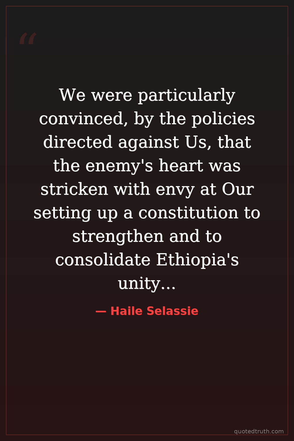 We were particularly convinced, by the policies directed against Us, that the enemy's heart was stricken with envy at Our setting up a constitution to strengthen and to consolidate Ethiopia's unity, at Our opening schools for boys and girls, at Our building hospitals in which Our people's health was to be safeguarded, as well as at all sorts of other initiatives of Ours by which Ethiopia's independence would be affirmed, not only in terms of history but in actual fact.