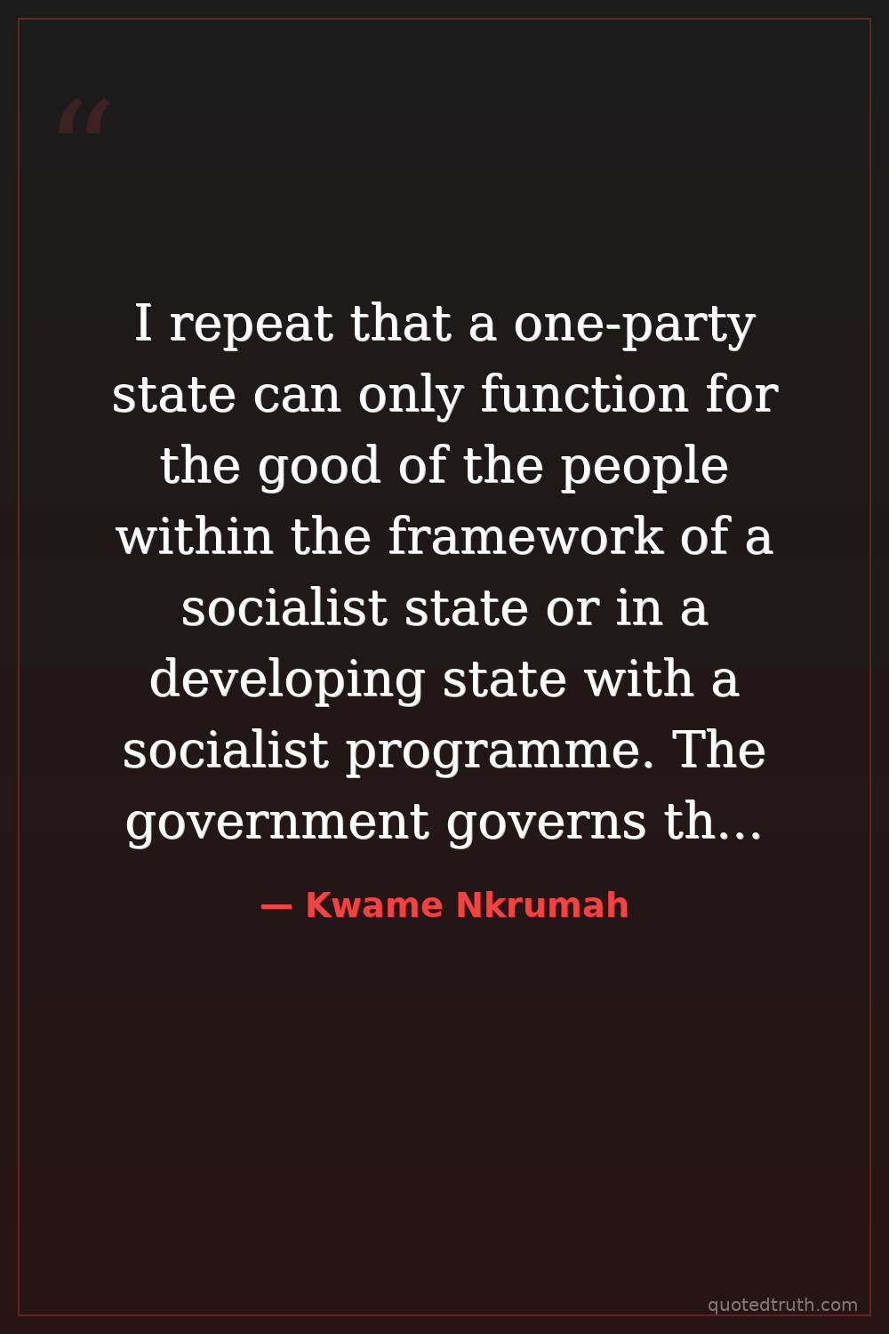 I repeat that a one-party state can only function for the good of the people within the framework of a socialist state or in a developing state with a socialist programme. The government governs through the people, and not through the class cleavages and interests. In other words, the basis of government is the will of the people.