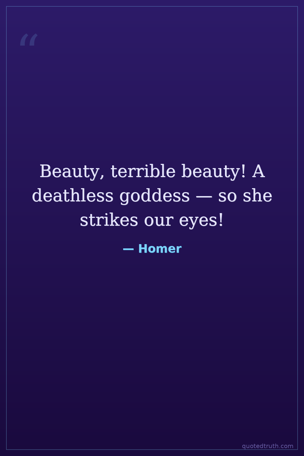 Beauty, terrible beauty! A deathless goddess — so she strikes our eyes!