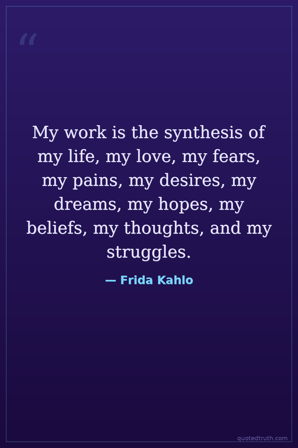 My work is the synthesis of my life, my love, my fears, my pains, my desires, my dreams, my hopes, my beliefs, my thoughts, and my struggles.
