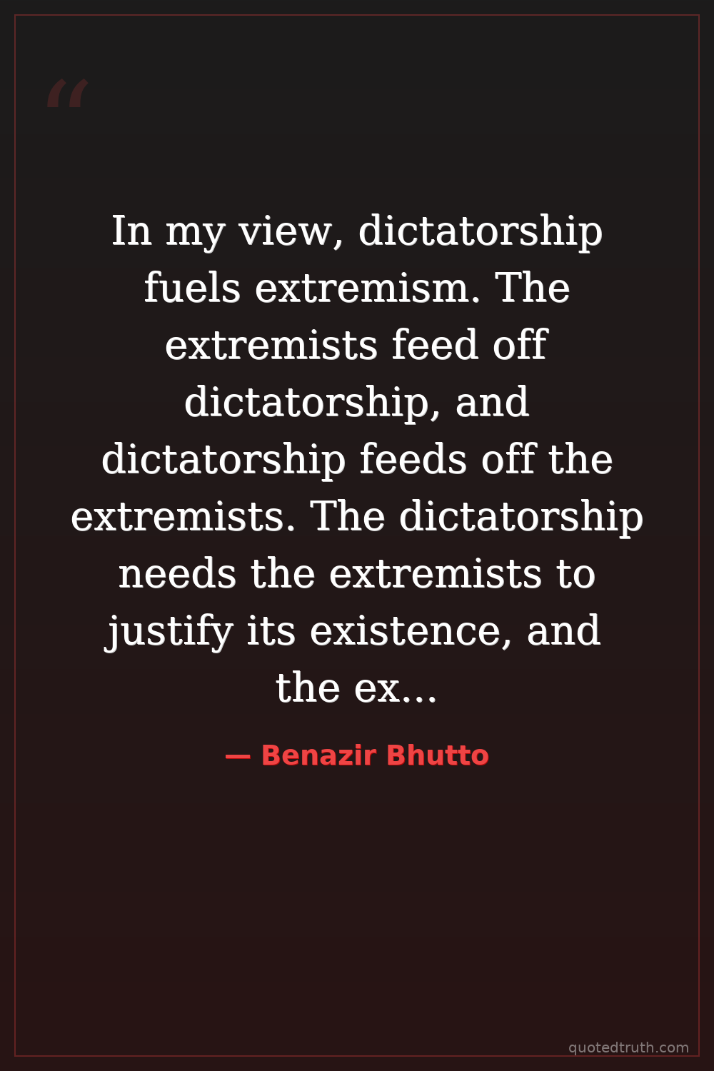 In my view, dictatorship fuels extremism. The extremists feed off dictatorship, and dictatorship feeds off the extremists. The dictatorship needs the extremists to justify its existence, and the extremists need dictatorship to expand and spread.