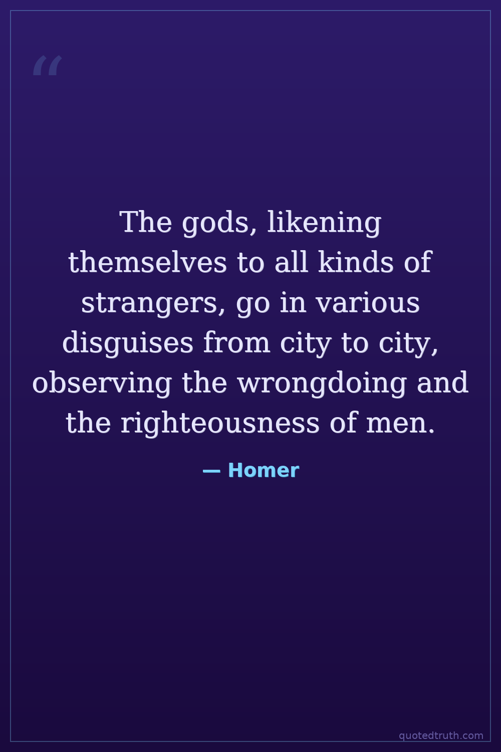 The gods, likening themselves to all kinds of strangers, go in various disguises from city to city, observing the wrongdoing and the righteousness of men.