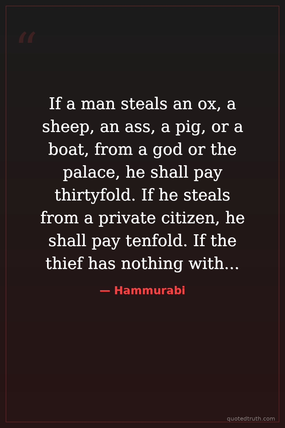If a man steals an ox, a sheep, an ass, a pig, or a boat, from a god or the palace, he shall pay thirtyfold. If he steals from a private citizen, he shall pay tenfold. If the thief has nothing with which to pay, he shall be put to death.