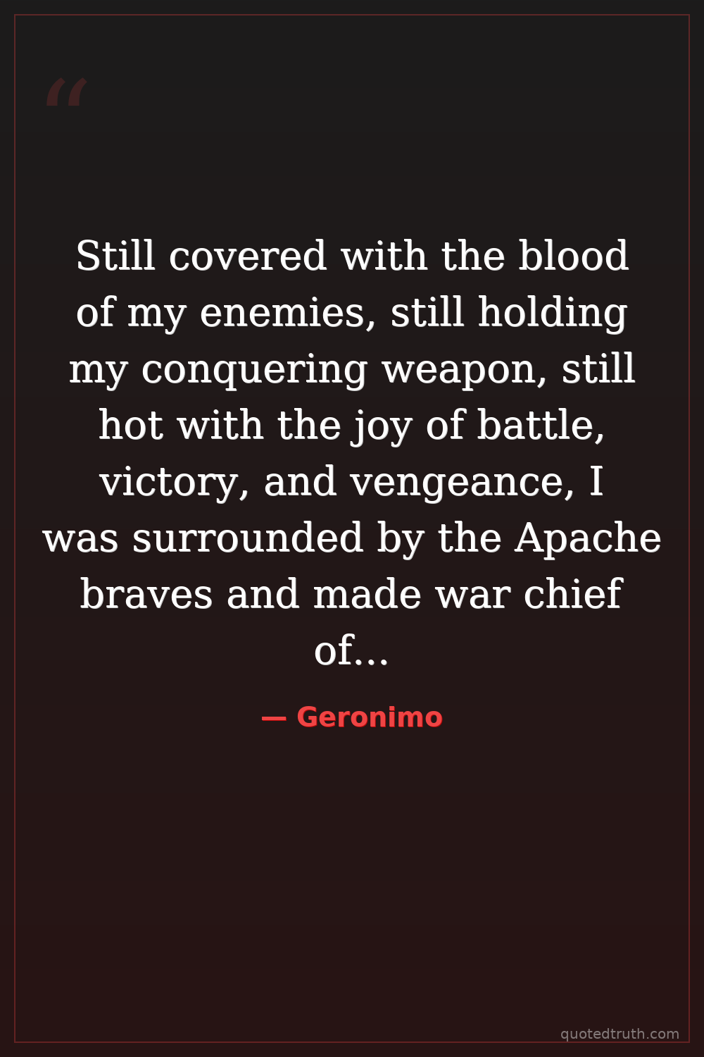 Still covered with the blood of my enemies, still holding my conquering weapon, still hot with the joy of battle, victory, and vengeance, I was surrounded by the Apache braves and made war chief of all the Apaches. Then I gave orders for scalping the slain.