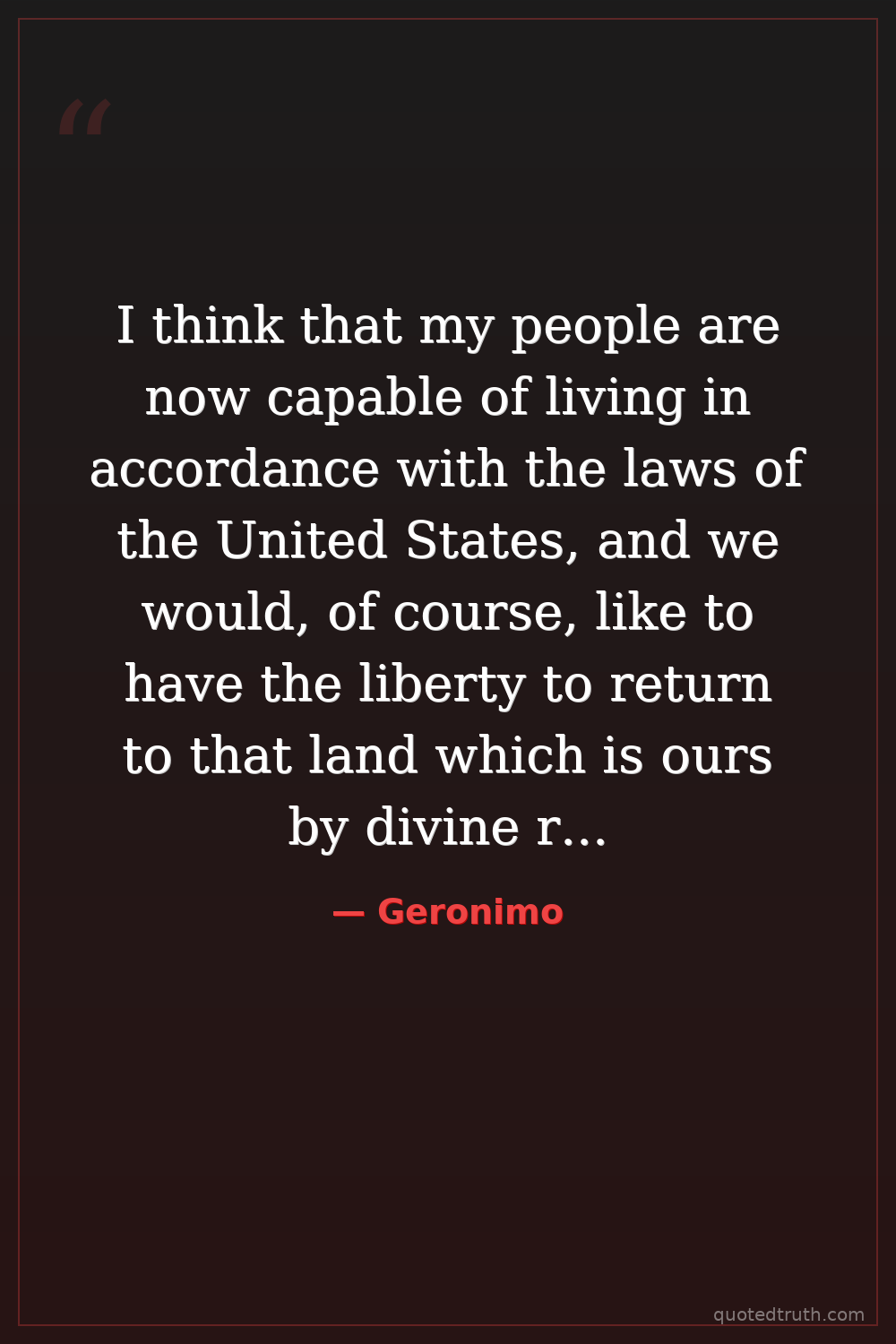 I think that my people are now capable of living in accordance with the laws of the United States, and we would, of course, like to have the liberty to return to that land which is ours by divine right.