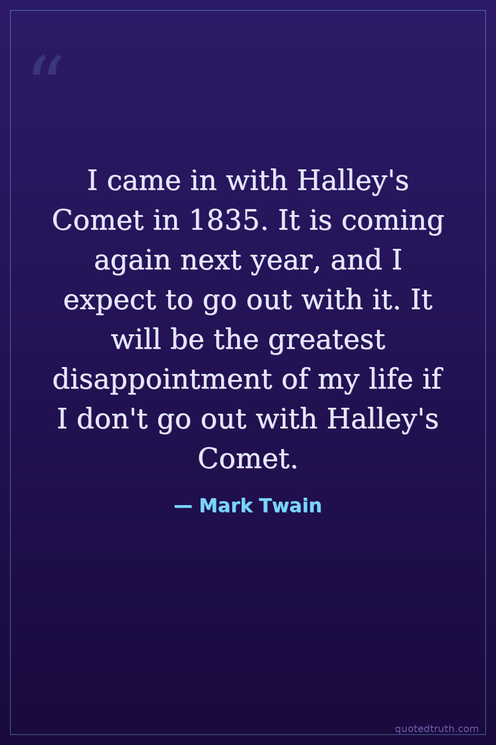 I came in with Halley's Comet in 1835. It is coming again next year, and I expect to go out with it. It will be the greatest disappointment of my life if I don't go out with Halley's Comet.