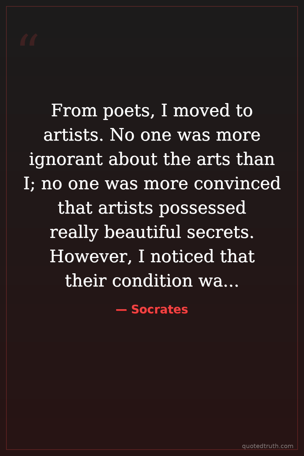 From poets, I moved to artists. No one was more ignorant about the arts than I; no one was more convinced that artists possessed really beautiful secrets. However, I noticed that their condition was no better than that of the poets and that both of them have the same misconceptions.