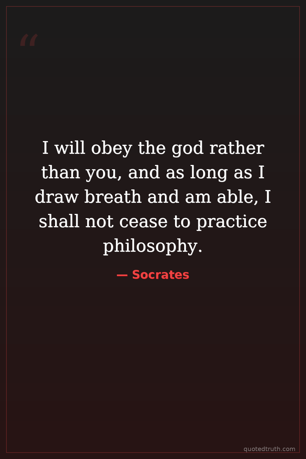 I will obey the god rather than you, and as long as I draw breath and am able, I shall not cease to practice philosophy.