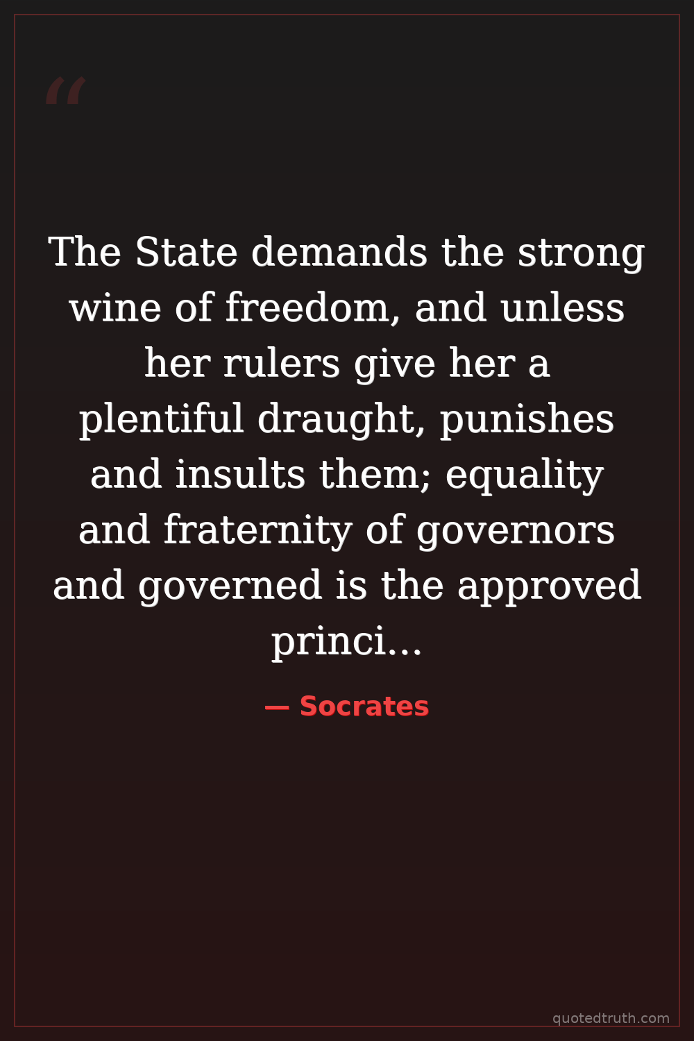 The State demands the strong wine of freedom, and unless her rulers give her a plentiful draught, punishes and insults them; equality and fraternity of governors and governed is the approved principle. Anarchy is the law, not of the State only, but of private houses, and extends even to the animals.