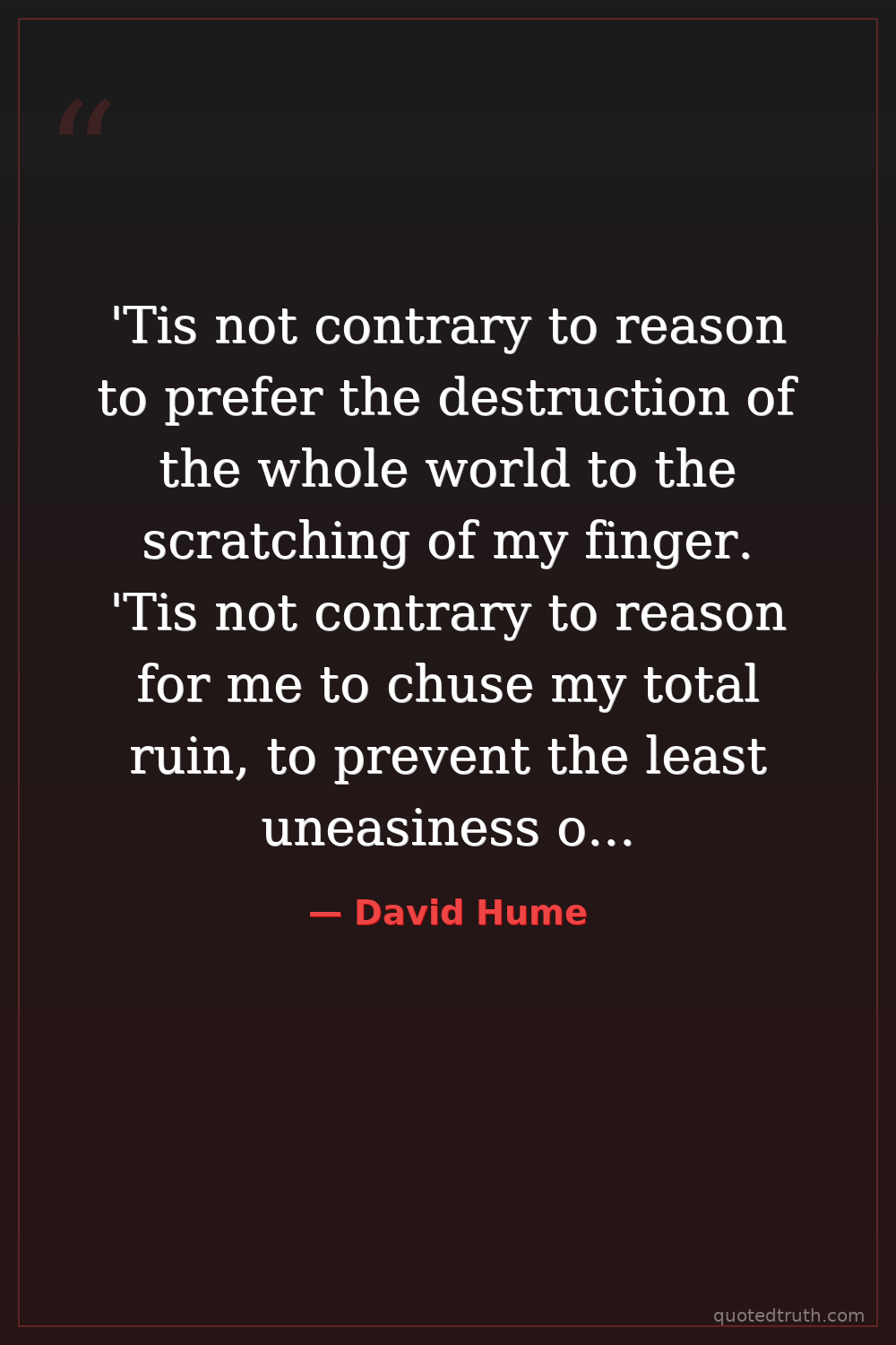 'Tis not contrary to reason to prefer the destruction of the whole world to the scratching of my finger. 'Tis not contrary to reason for me to chuse my total ruin, to prevent the least uneasiness of an Indian or personal wholly unknown to me.