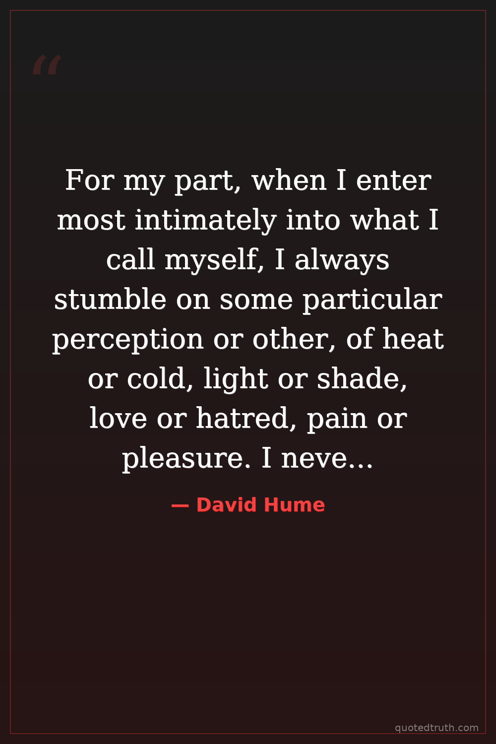 For my part, when I enter most intimately into what I call myself, I always stumble on some particular perception or other, of heat or cold, light or shade, love or hatred, pain or pleasure. I never can catch myself at any time without a perception, and never can observe any thing but the perception….