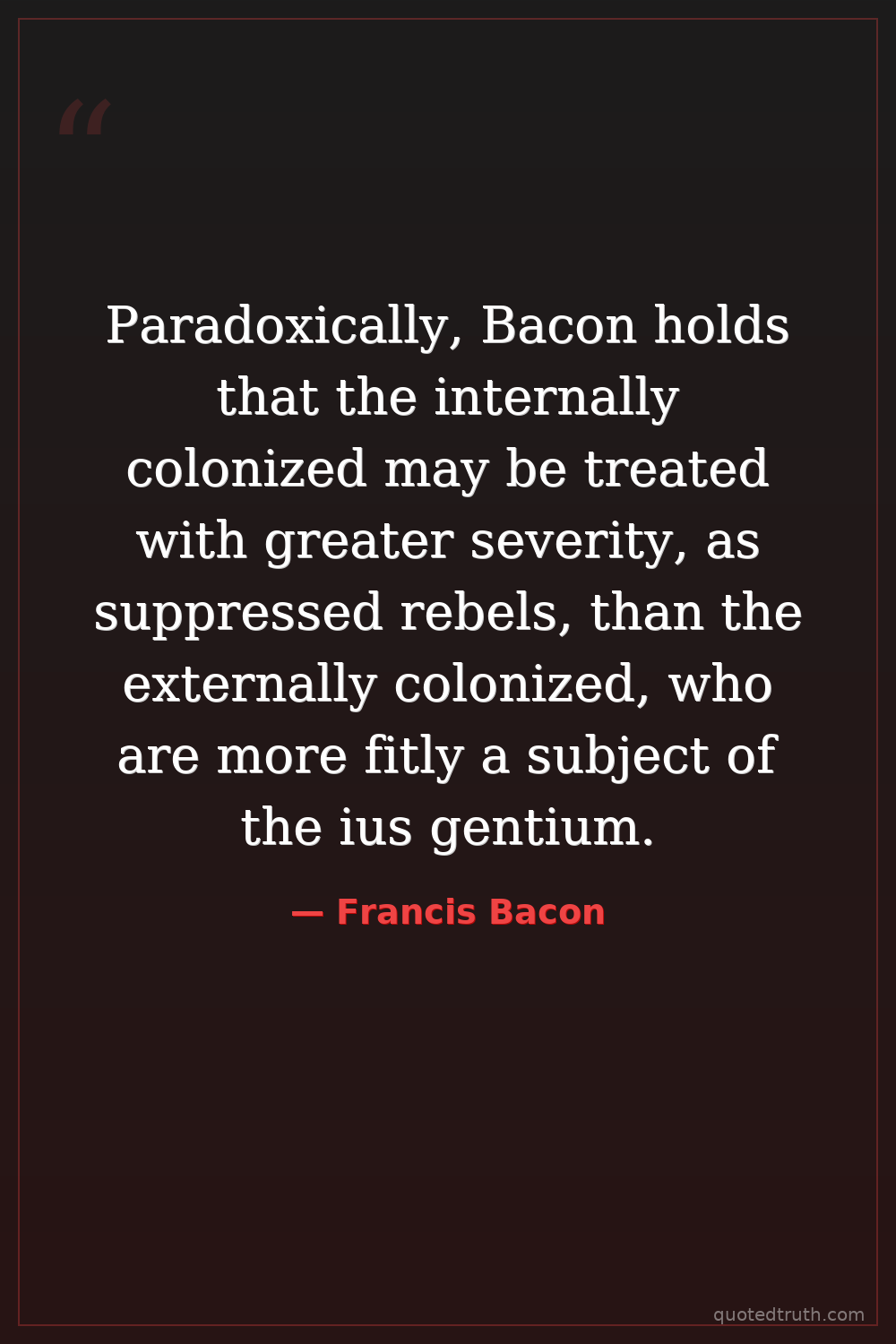 Paradoxically, Bacon holds that the internally colonized may be treated with greater severity, as suppressed rebels, than the externally colonized, who are more fitly a subject of the ius gentium.