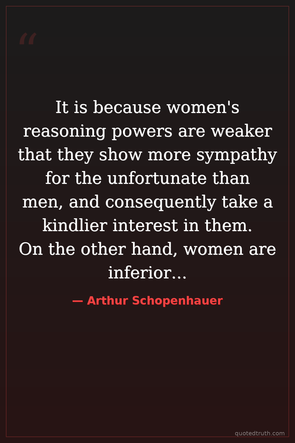It is because women's reasoning powers are weaker that they show more sympathy for the unfortunate than men, and consequently take a kindlier interest in them. On the other hand, women are inferior to men in matters of justice, honesty, and conscientiousness.