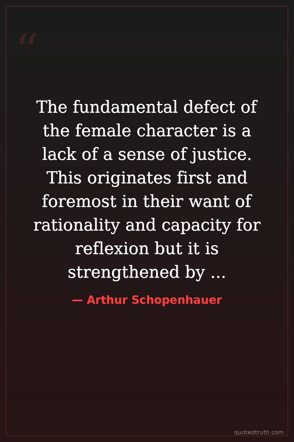 The fundamental defect of the female character is a lack of a sense of justice. This originates first and foremost in their want of rationality and capacity for reflexion but it is strengthened by the fact that, as the weaker sex, they are driven to rely not on force but on cunning: hence their instinctive subtlety and their ineradicable tendency to tell lies.