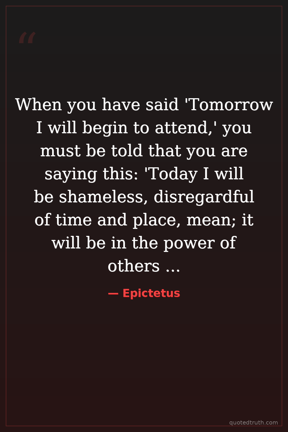 When you have said 'Tomorrow I will begin to attend,' you must be told that you are saying this: 'Today I will be shameless, disregardful of time and place, mean; it will be in the power of others to give me pain, today I will be passionate and envious. See how many evil things you are permitting yourself to do.'