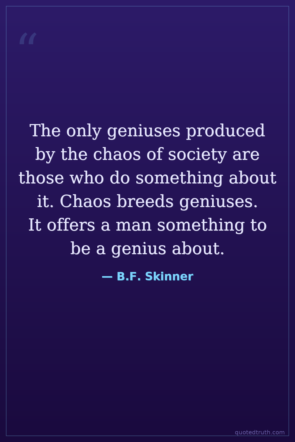 The only geniuses produced by the chaos of society are those who do something about it. Chaos breeds geniuses. It offers a man something to be a genius about.