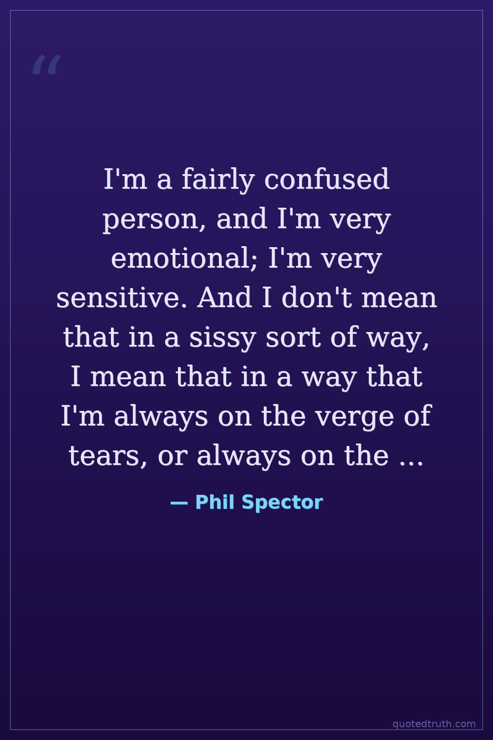 I'm a fairly confused person, and I'm very emotional; I'm very sensitive. And I don't mean that in a sissy sort of way, I mean that in a way that I'm always on the verge of tears, or always on the verge of anger.