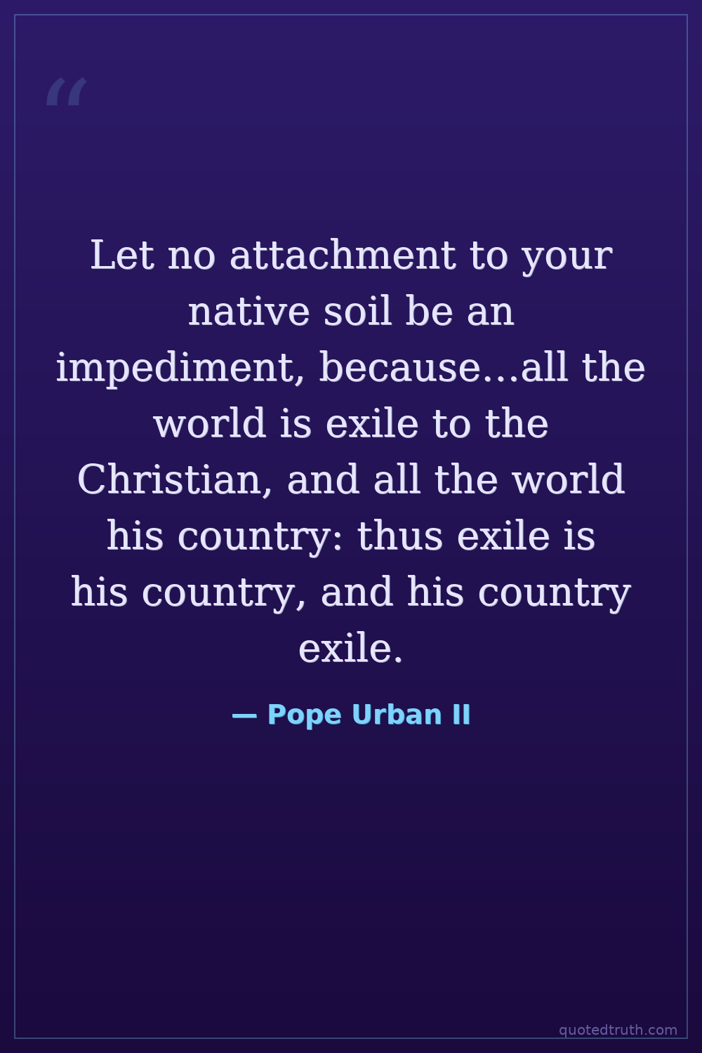 Let no attachment to your native soil be an impediment, because…all the world is exile to the Christian, and all the world his country: thus exile is his country, and his country exile.