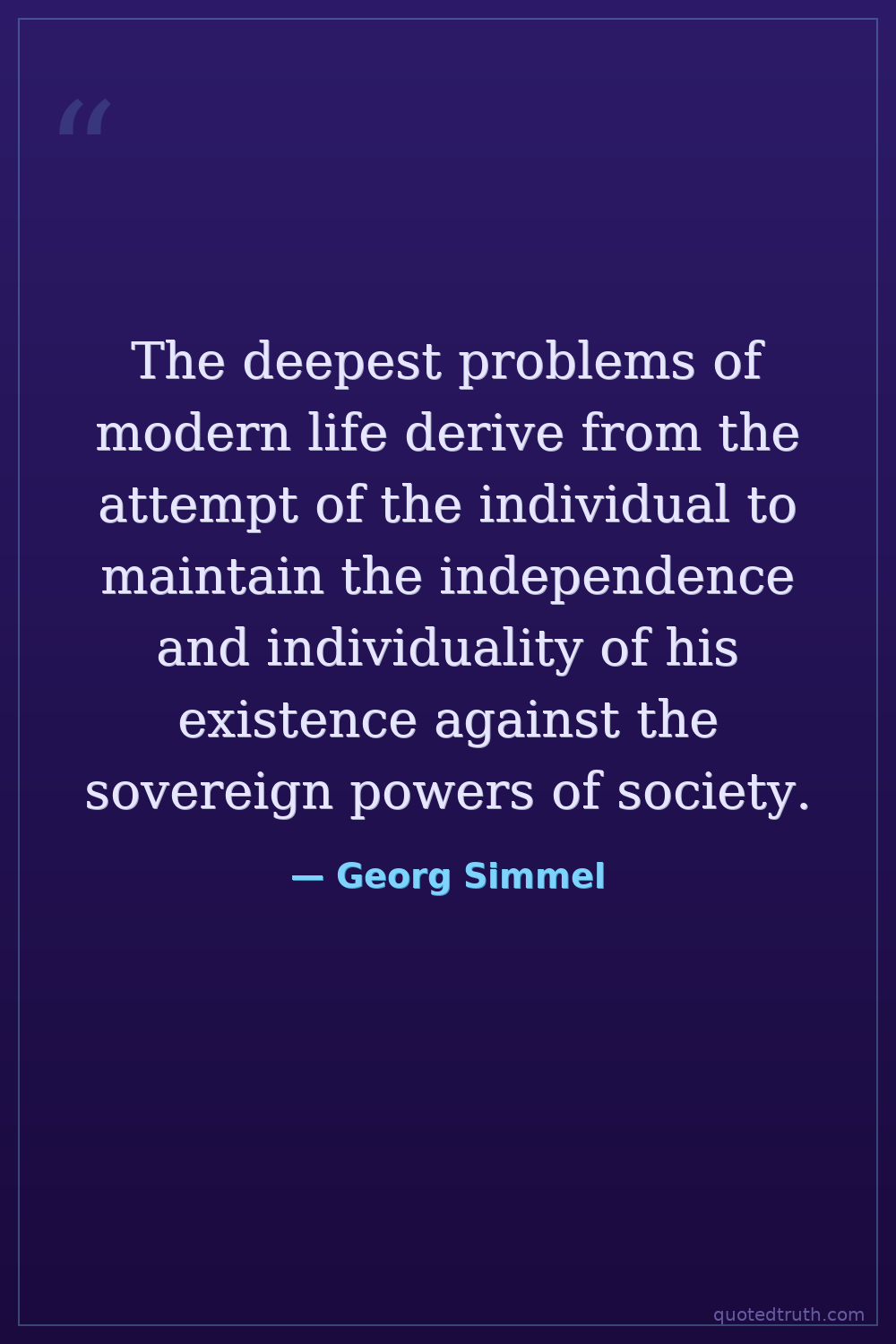 The deepest problems of modern life derive from the attempt of the individual to maintain the independence and individuality of his existence against the sovereign powers of society.