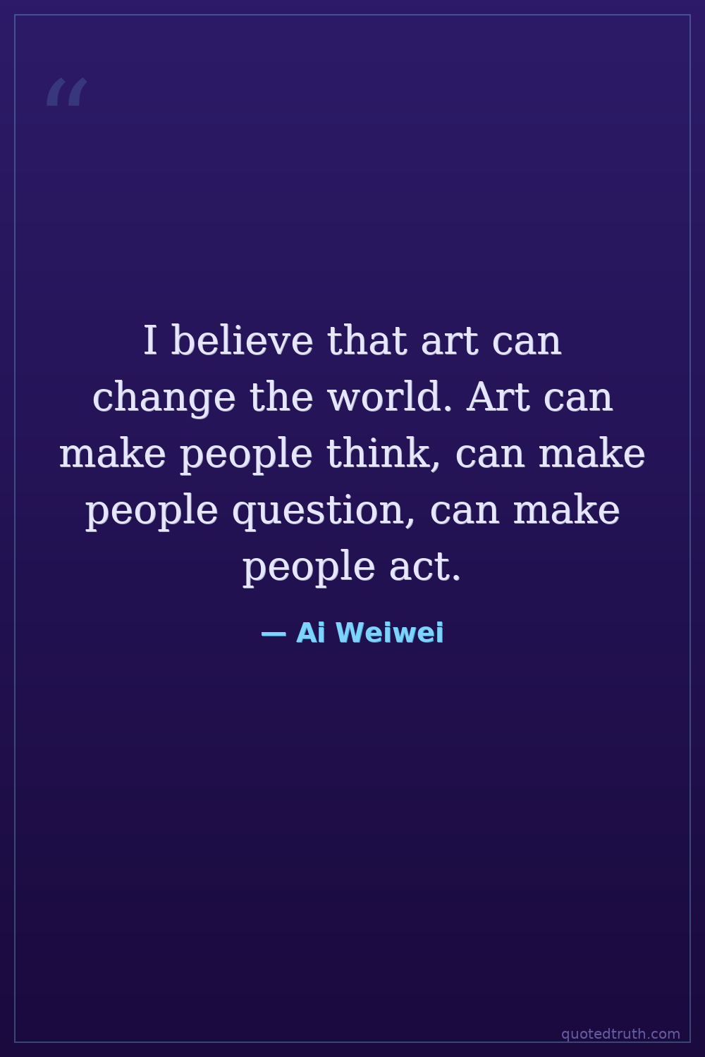 I believe that art can change the world. Art can make people think, can make people question, can make people act.