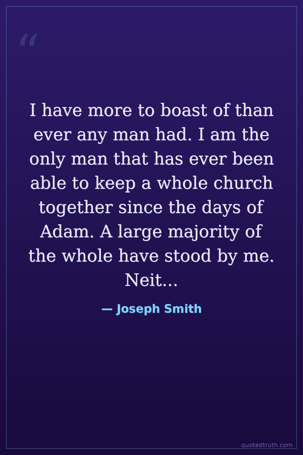 I have more to boast of than ever any man had. I am the only man that has ever been able to keep a whole church together since the days of Adam. A large majority of the whole have stood by me. Neither Paul, John, Peter, nor Jesus ever did it. I boast that no man ever did such a work as I. The followers of Jesus ran away from Him; but the Latter-day Saints never ran away from me yet.