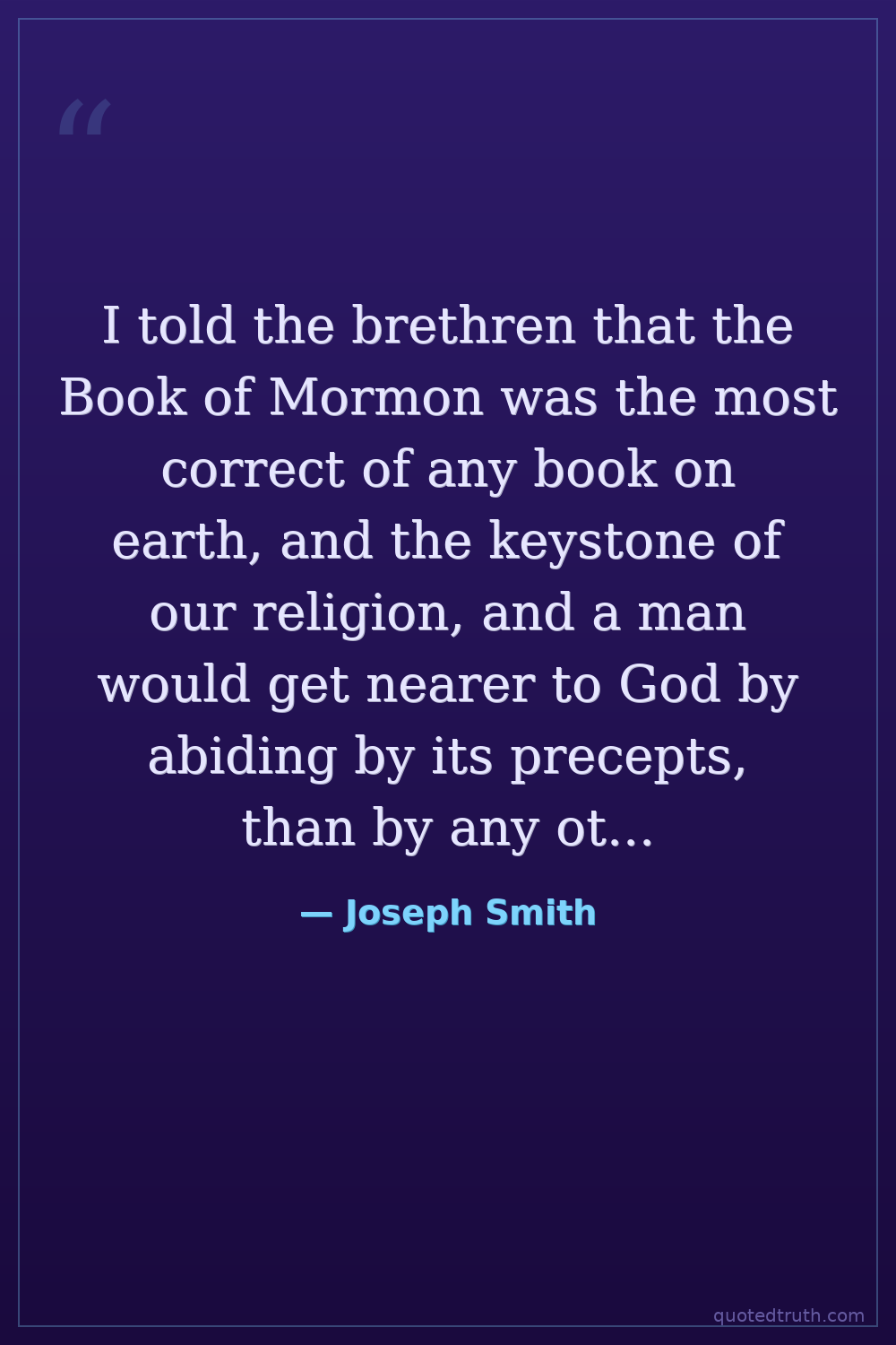 I told the brethren that the Book of Mormon was the most correct of any book on earth, and the keystone of our religion, and a man would get nearer to God by abiding by its precepts, than by any other book.