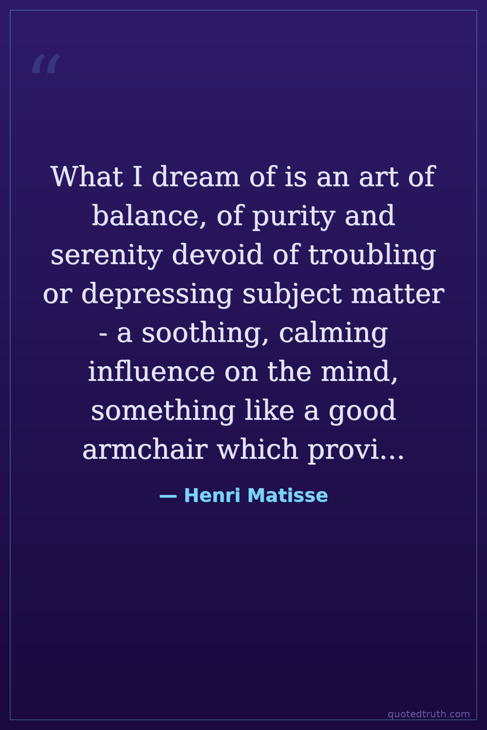 What I dream of is an art of balance, of purity and serenity devoid of troubling or depressing subject matter - a soothing, calming influence on the mind, something like a good armchair which provides relaxation from physical fatigue. — Henri Matisse Modern Fauvist painter
