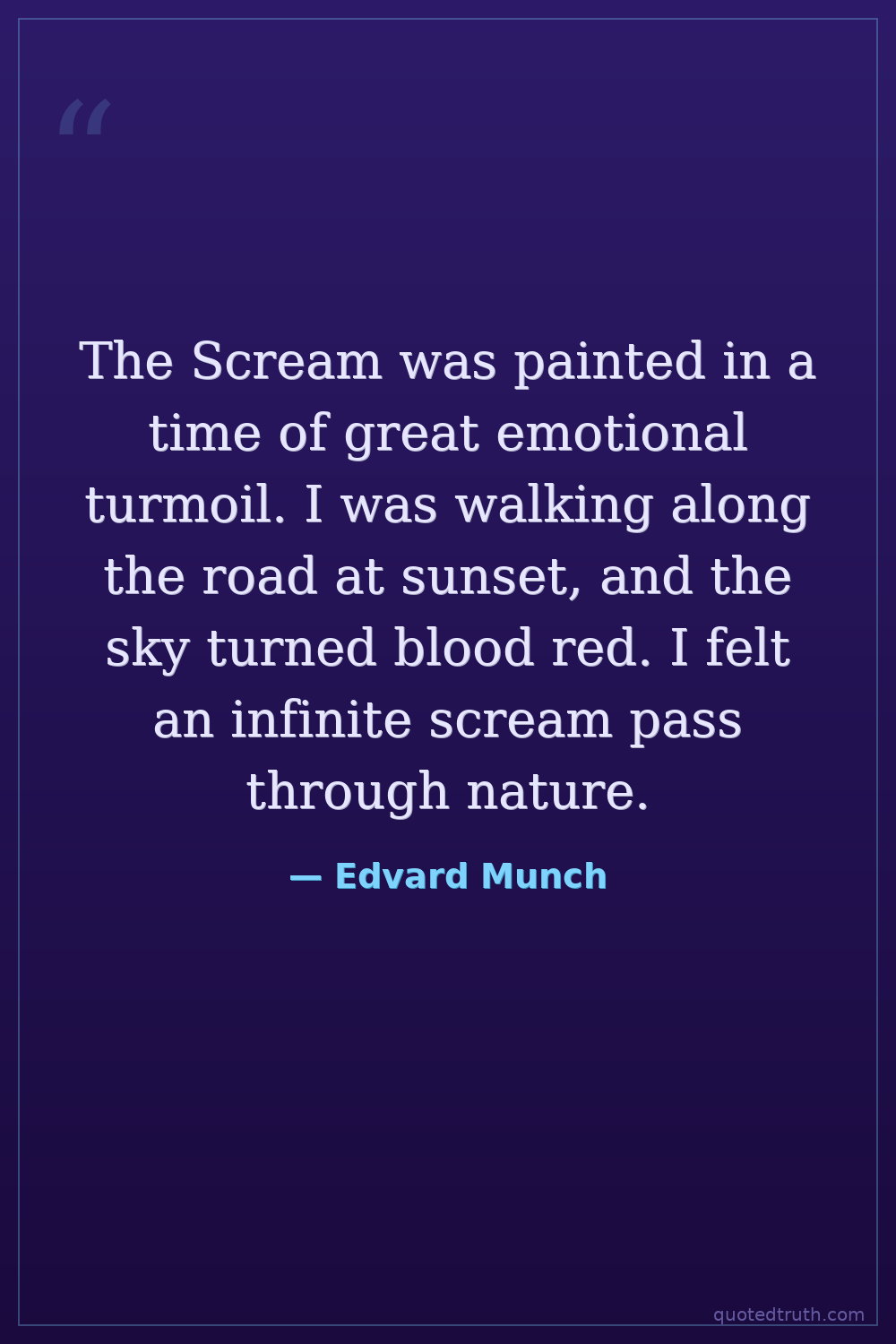 The Scream was painted in a time of great emotional turmoil. I was walking along the road at sunset, and the sky turned blood red. I felt an infinite scream pass through nature.