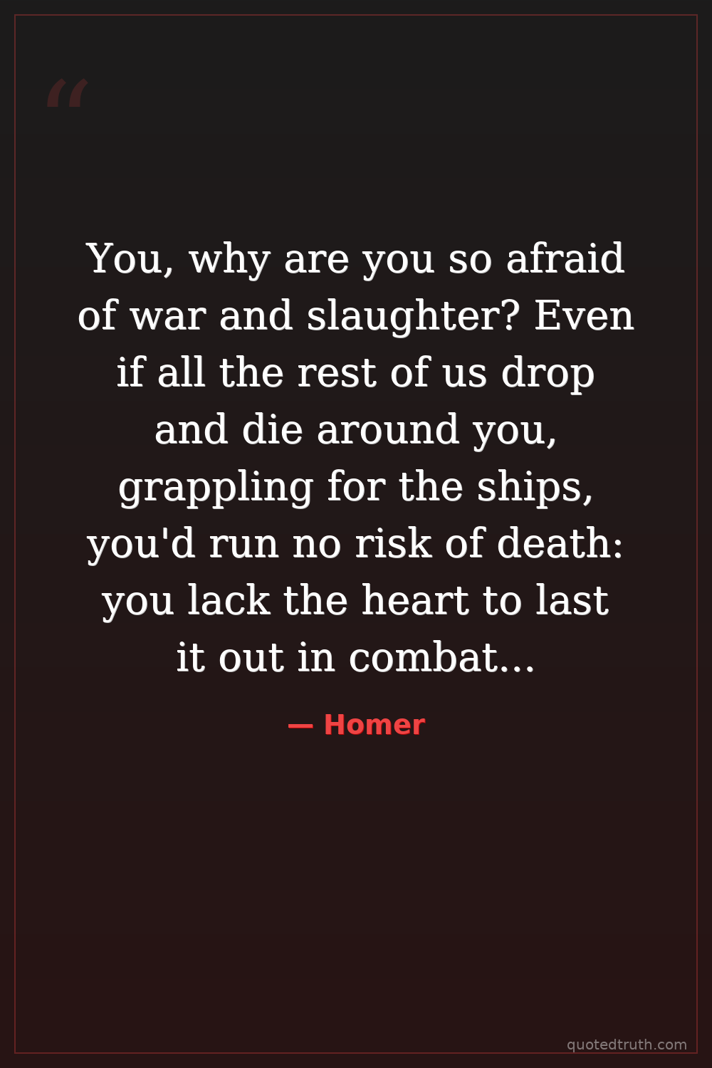You, why are you so afraid of war and slaughter? Even if all the rest of us drop and die around you, grappling for the ships, you'd run no risk of death: you lack the heart to last it out in combat—coward!