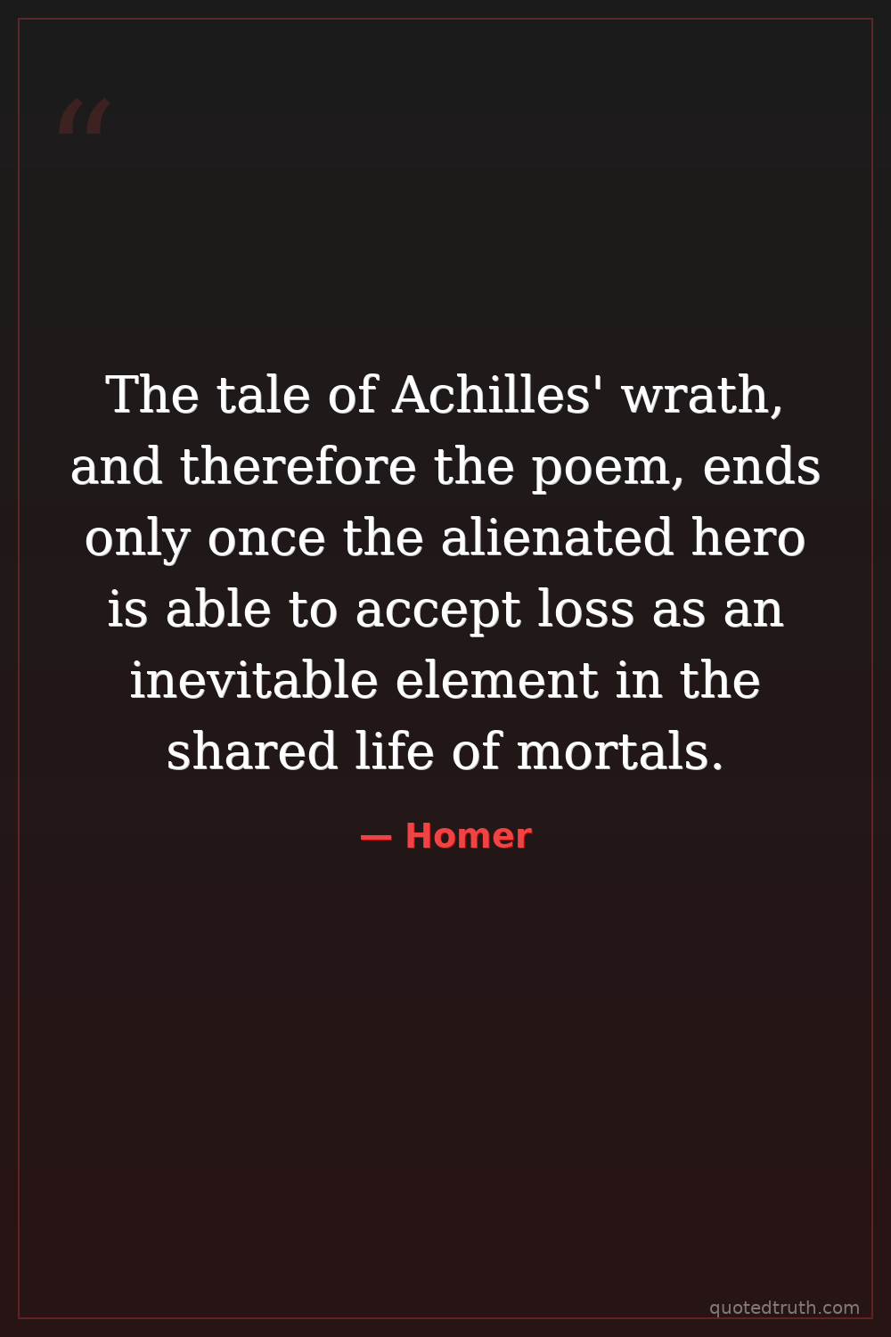 The tale of Achilles' wrath, and therefore the poem, ends only once the alienated hero is able to accept loss as an inevitable element in the shared life of mortals.