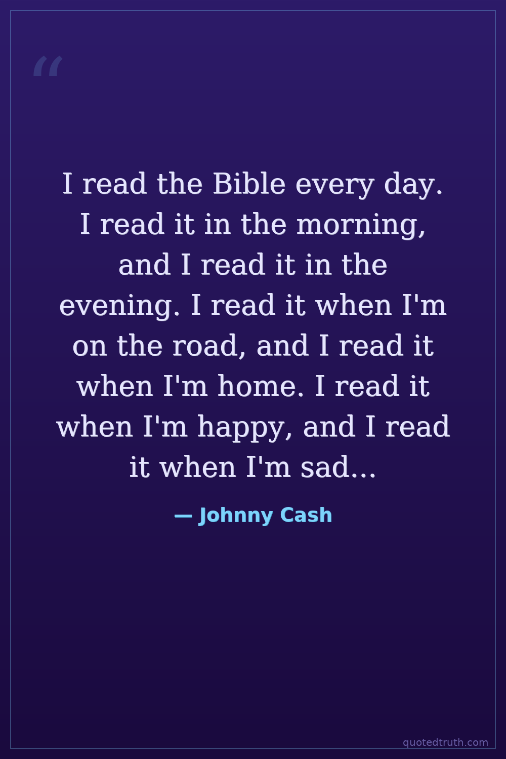 I read the Bible every day. I read it in the morning, and I read it in the evening. I read it when I'm on the road, and I read it when I'm home. I read it when I'm happy, and I read it when I'm sad. I read it when I'm well, and I read it when I'm sick. I read it when I'm tired, and I read it when I'm rested. I read it when I'm alone, and I read it when I'm with people. I read it when I'm awake, and I read it when I'm asleep. I read it when I'm hungry, and I read it when I'm full. I read it when I'm thirsty, and I read it when I'm not. I read it when I'm cold, and I read it when I'm hot. I read it when I'm wet, and I read it when I'm dry. I read it when I'm clean, and I read it when I'm dirty. I read it when I'm dressed, and I read it when I'm naked. I read it when I'm alive, and I read it when I'm dead. I read it when I'm buried, and I read it when I'm resurrected. I read it when I'm in heaven, and I read it when I'm in hell. I read it when I'm in purgatory, and I read it when I'm in limbo. I read it when I'm in paradise, and I read it when I'm in perdition. I read it when I'm in bliss, and I read it when I'm in agony. I read it when I'm in joy, and I read it when I'm in sorrow. I read it when I'm in peace, and I read it when I'm in war. I read it when I'm in love, and I read it when I'm in hate. I read it when I'm in faith, and I read it when I'm in doubt. I read it when I'm in hope, and I read it when I'm in despair. I read it when I'm in truth, and I read it when I'm in lies. I read it when I'm in light, and I read it when I'm in darkness. I read it when I'm in good, and I read it when I'm in evil. I read it when I'm in right, and I read it when I'm in wrong. I read it when I'm in wisdom, and I read it when I'm in folly. I read it when I'm in knowledge, and I read it when I'm in ignorance. I read it when I'm in understanding, and I read it when I'm in confusion. I read it when I'm in clarity, and I read it when I'm in obscurity. I read it when I'm in simplicity, and I read it when I'm in complexity. I read it when I'm in order, and I read it when I'm in chaos. I read it when I'm in harmony, and I read it when I'm in discord. I read it when I'm in beauty, and I read it when I'm in ugliness. I read it when I'm in strength, and I read it when I'm in weakness. I read it when I'm in courage, and I read it when I'm in fear. I read it when I'm in bravery, and I read it when I'm in cowardice. I read it when I'm in justice, and I read it when I'm in injustice. I read it when I'm in mercy, and I read it when I'm in cruelty. I read it when I'm in compassion, and I read it when I'm in apathy. I read it when I'm in forgiveness, and I read it when I'm in resentment. I read it when I'm in grace, and I read it when I'm in sin. I read it when I'm in redemption, and I read it when I'm in damnation. I read it when I'm in salvation, and I read it when I'm in perdition. I read it when I'm in blessing, and I read it when I'm in curse. I read it when I'm in peace, and I read it when I'm in war. I read it when I'm in life, and I read it when I'm in death. I read it when I'm in beginning, and I read it when I'm in end. I read it when I'm in alpha, and I read it when I'm in omega. I read it when I'm in all, and I read it when I'm in nothing. I read it when I'm in everything, and I read it when I'm in anything. I read it when I'm in something, and I read it when I'm in no