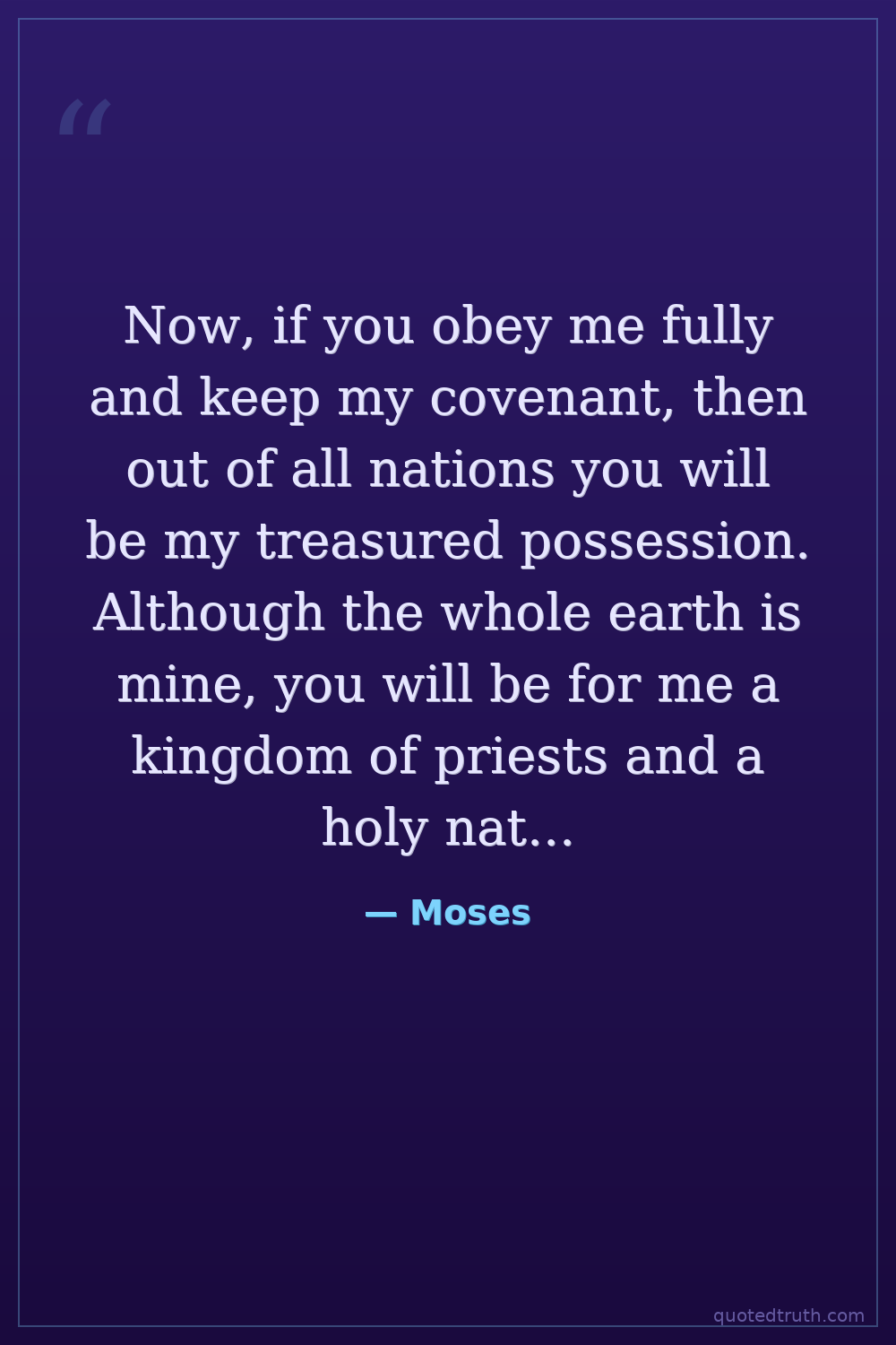 Now, if you obey me fully and keep my covenant, then out of all nations you will be my treasured possession. Although the whole earth is mine, you will be for me a kingdom of priests and a holy nation.
