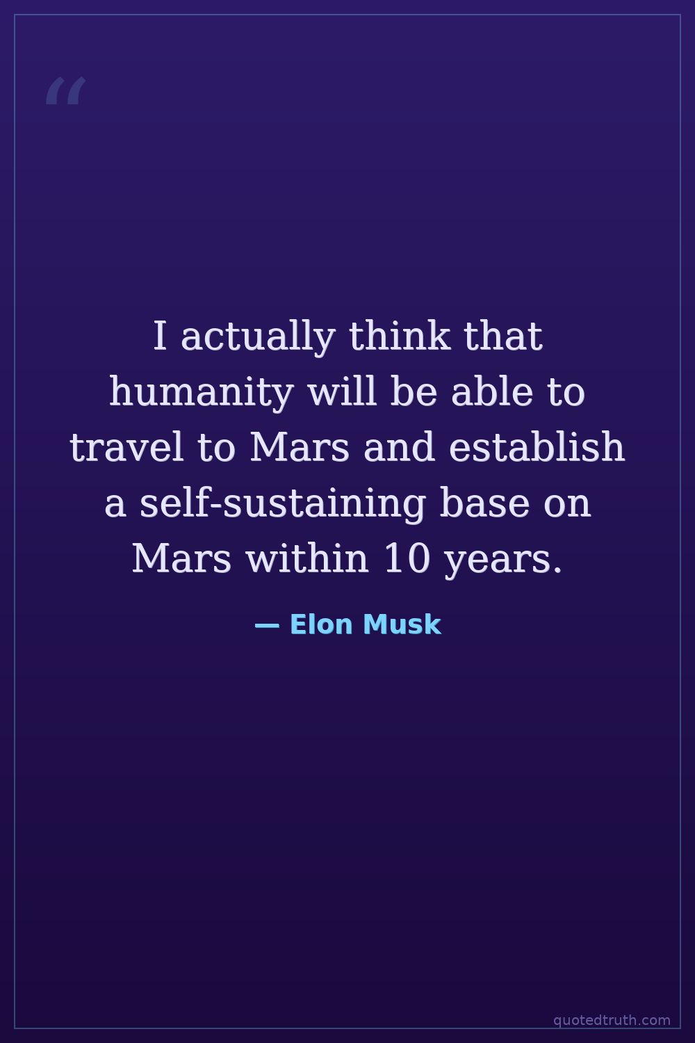 I actually think that humanity will be able to travel to Mars and establish a self-sustaining base on Mars within 10 years.