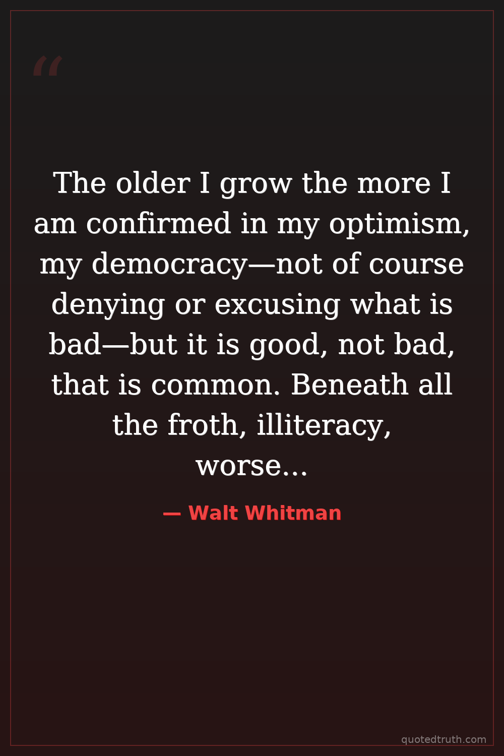 The older I grow the more I am confirmed in my optimism, my democracy—not of course denying or excusing what is bad—but it is good, not bad, that is common. Beneath all the froth, illiteracy, worse, there is something latent—now and then to break forth—which cannot be defied, which saves us at last.