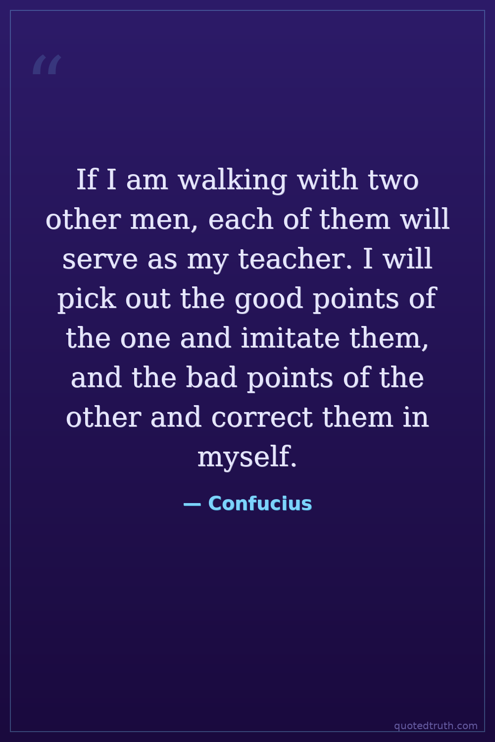 If I am walking with two other men, each of them will serve as my teacher. I will pick out the good points of the one and imitate them, and the bad points of the other and correct them in myself.