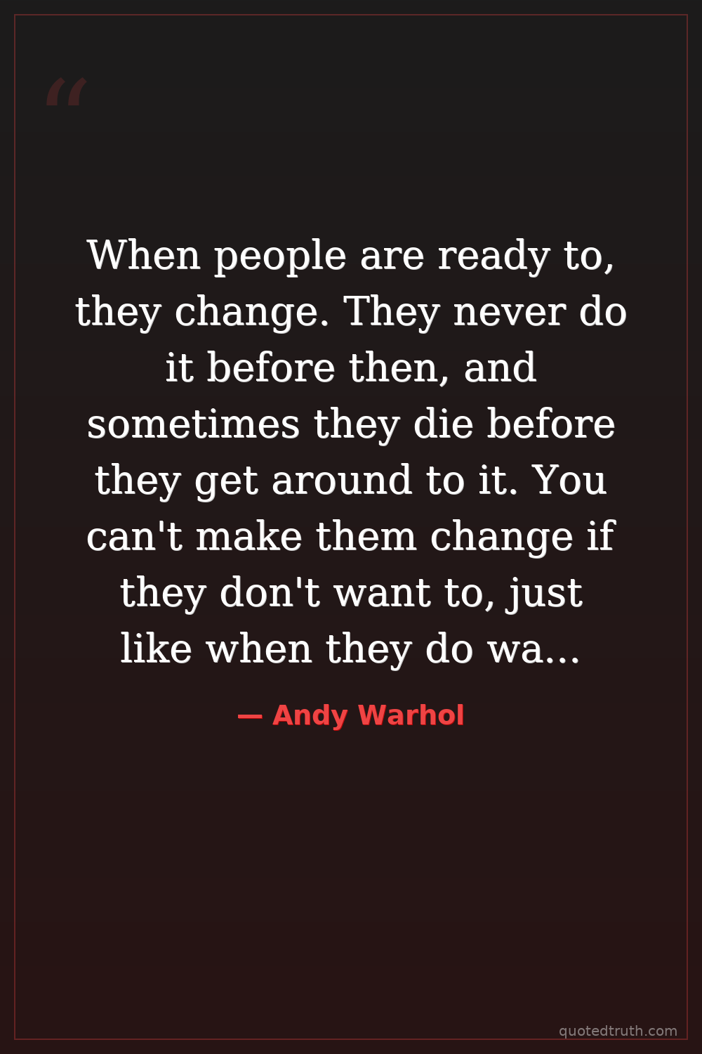 When people are ready to, they change. They never do it before then, and sometimes they die before they get around to it. You can't make them change if they don't want to, just like when they do want to, you can't stop them.