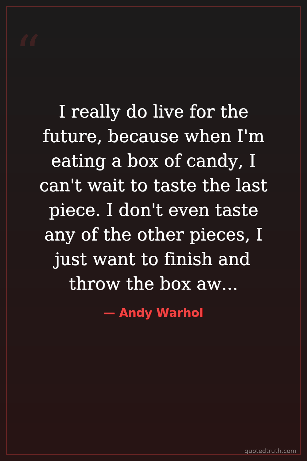 I really do live for the future, because when I'm eating a box of candy, I can't wait to taste the last piece. I don't even taste any of the other pieces, I just want to finish and throw the box away and not to have it on my mind any more. I would rather either have it now or know I'll never have it so I don't have to think about it.