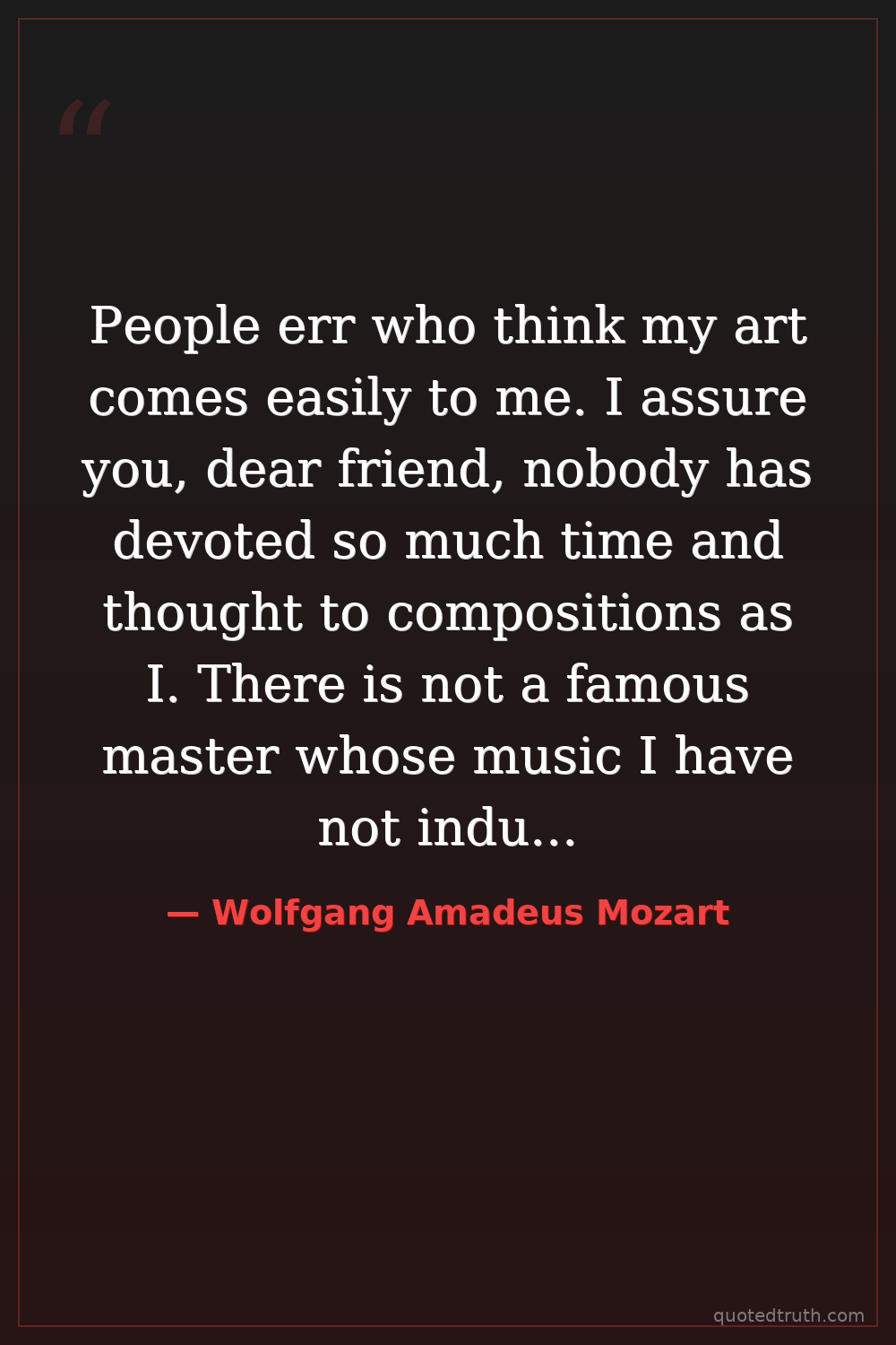 People err who think my art comes easily to me. I assure you, dear friend, nobody has devoted so much time and thought to compositions as I. There is not a famous master whose music I have not industriously studied through many times. — Wolfgang Amadeus Mozart Early Modern Prodigy composer