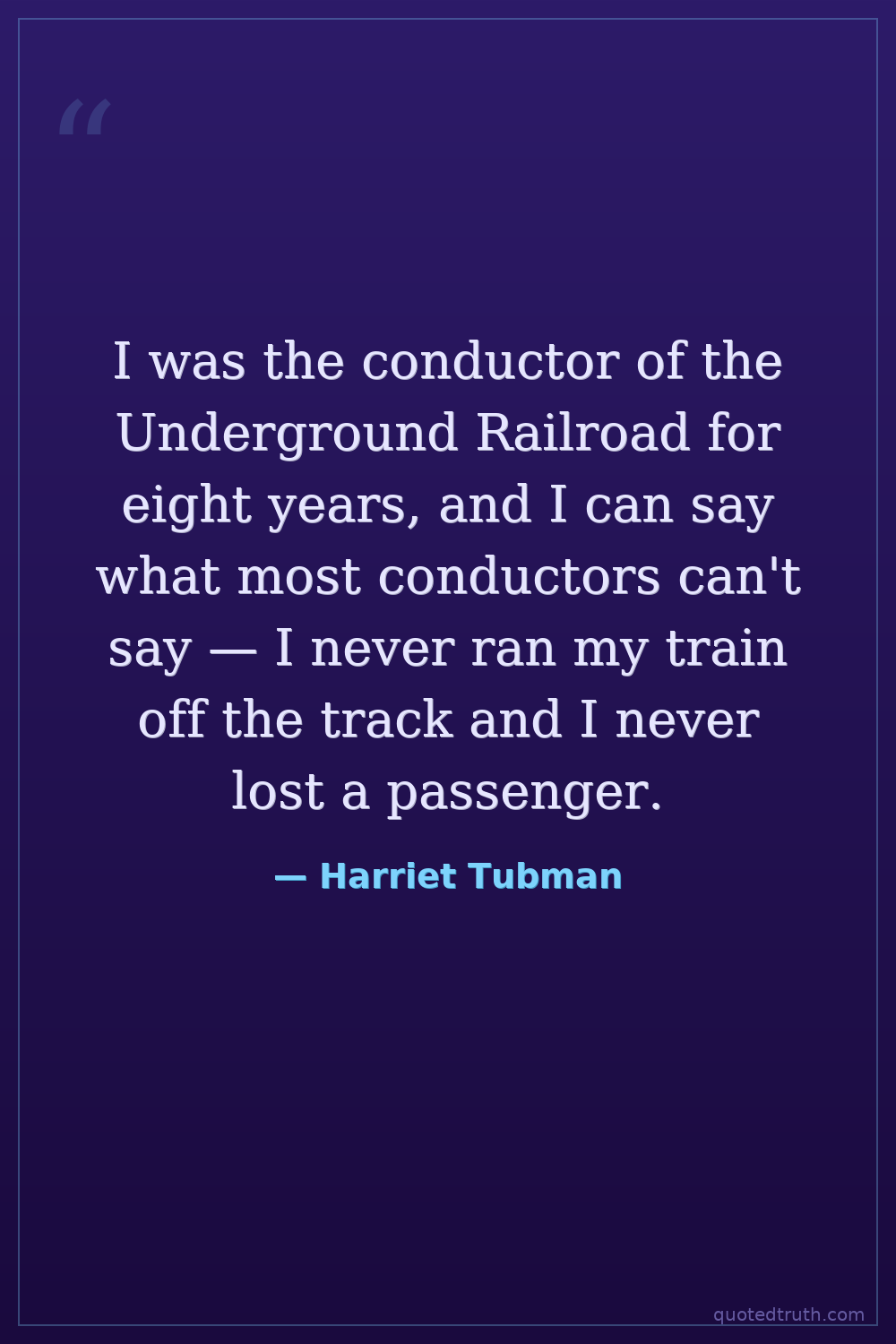 I was the conductor of the Underground Railroad for eight years, and I can say what most conductors can't say — I never ran my train off the track and I never lost a passenger.
