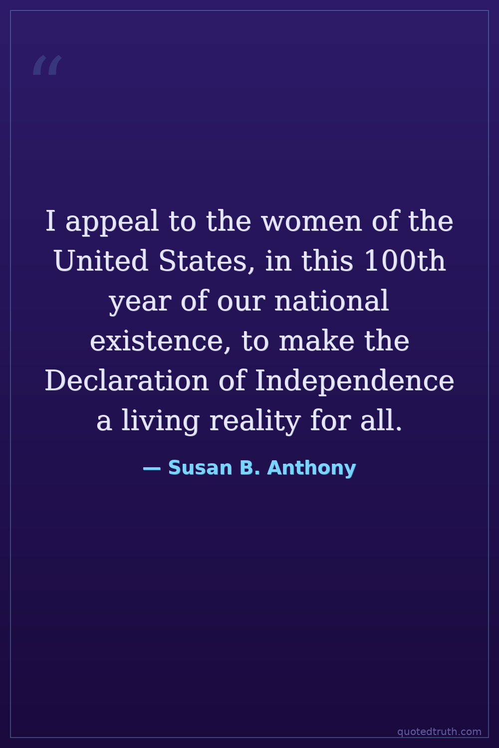 I appeal to the women of the United States, in this 100th year of our national existence, to make the Declaration of Independence a living reality for all.